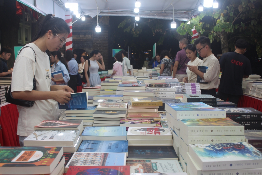 Độc giả trẻ hào hứng với hoạt động quyên góp sách ủng hộ tủ sách thư viện cho các trường bị ảnh hưởng bởi bão lũ ngoại thành Hà Nội. Ảnh: MỘC MIÊN Diễn ra vào cuối tháng 9, trong tiết trời Thu nắng vàng như mật, Hội sách Hà Nội năm 2024 đã trở thành điểm đến yêu thích của độc giả xa, gần. Trước giờ “G” ngày khai mạc, không khí tại các gian hàng sách tấp nập dòng người đến tham quan, mua sắm. Những cuốn sách thơm mùi giấy mới được sắp đặt ngay ngắn theo từng thể loại, đề tài. Độc giả thực sự choáng ngợp trước hàng nghìn đầu sách hay được phục vụ miễn phí, đa dạng các lĩnh vực kinh tế, chính trị, văn hóa, quân sự, ngoại giao của Nhà xuất bản Hà Nội và các tác phẩm viết về Hà Nội tại triển lãm sách: “Hà Nội: Thủ đô văn hiến, anh hùng - Thành phố vì hòa bình”. Đây là dịp giới trẻ được hòa mình vào không gian văn hóa đa màu sắc và khám phá tri thức về những giá trị văn hóa truyền của mảnh đất Thăng Long - Hà Nội. Trong đó, có hai tác phẩm “Làng làng phố phố Hà Nội” (tác giả Nguyễn Ngọc Tiến) và tác phẩm thơ “Bay qua Hồ Gươm” (tác giả Huỳnh Mai Liên) lần đầu được giới thiệu tại Hội sách, gắn với chủ đề chào mừng 70 năm ngày Giải phóng Thủ đô. Dạo quanh các gian hàng sách, không khó bắt gặp độc giả trẻ say sưa tìm hiểu và tìm đọc các cuốn sách về lịch sử, văn hóa, chính trị của đất nước, các em nhỏ hào hứng với cuốn truyện tranh, các tín đồ của văn hóa đọc thích thú khi cầm trên tay những đầu sách hay. Đó còn là sự hiếu kỳ của du khách quốc tế về không khí sôi động của Hội sách Hà Nội.