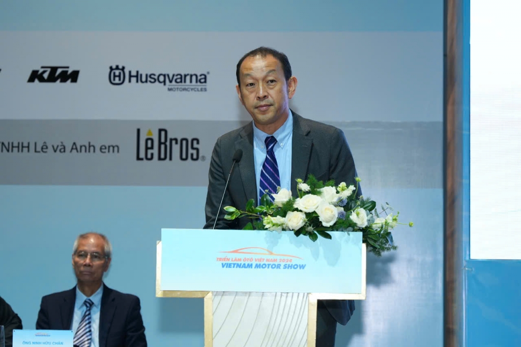 Ông Nakano Keita - Chủ tịch Hiệp hội các Nhà sản xuất Ô tô Việt Nam phát biểu tại sự kiện. Ảnh: Thùy Linh Phát biểu tại họp báo, ông Nakano Keita - Chủ tịch Hiệp hội các Nhà sản xuất Ô tô Việt Nam (VAMA) cho biết: “Ngành công nghiệp ô tô Việt Nam hiện đang trải qua giai đoạn phát triển mạnh mẽ với nhiều triển vọng, đặc biệt là xu hướng chuyển dịch sang các dòng xe điện và xe hybrid. Tại Vietnam Motor Show 2024, khách tham dự sẽ được chiêm ngưỡng những mẫu xe hiện đại, đa dạng về mức giá, từ xe tiết kiệm nhiên liệu đến xe đa dụng, sẵn sàng đáp ứng nhu cầu của người tiêu dùng trong bối cảnh kinh tế hiện nay. Chúng tôi tin rằng, với sự chuẩn bị kỹ lưỡng và tinh thần đổi mới không ngừng, Vietnam Motor Show 2024 sẽ là nơi khởi đầu cho những xu hướng mới và tiến bộ công nghệ, góp phần phát triển thị trường ô tô Việt Nam”. Với tinh thần chuẩn bị hết sức chu đáo, khoa học, Vietnam Motor Show 2024 hứa hẹn sẽ mang đến cho công chúng những trải nghiệm vượt trội, xứng đáng là triển lãm thường niên lớn nhất của ngành công nghiệp ô tô, xe máy Việt Nam trong nhiều năm qua. Thùy Linh